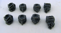 Pora przyjrzeć się elementom zestawu. O ile rzeźby są ciekawe (trzymają się estetyki nurglowej) i rozmiarami nie odstają zbytnio od Warhammera (jak ich już pomaluję, zrobię zdjęcie-zestawienie), o tyle jakość odlewów jest niestety w zestawieniu z GW słaba. Podstawowa różnica to, o czym już wspomniałem, czyli tworzywo. Zastosowane do odlewów PVC jest dużo twardsze i trudniejsze w obróbce niż typowy figurkowy polistyren. Jest wyraźnie mniej sprężyste, ale za to do pewnego stopnia podatne na wyginanie - wykrzywione elementy można naprostować. Co więcej, zgodnie z instrukcją, tam, gdzie samo mechaniczne działanie nie wystarczy, może pomóc metoda znana z obróbki finecastu i innych żywic, czyli kąpiel w ciepłej wodzie.